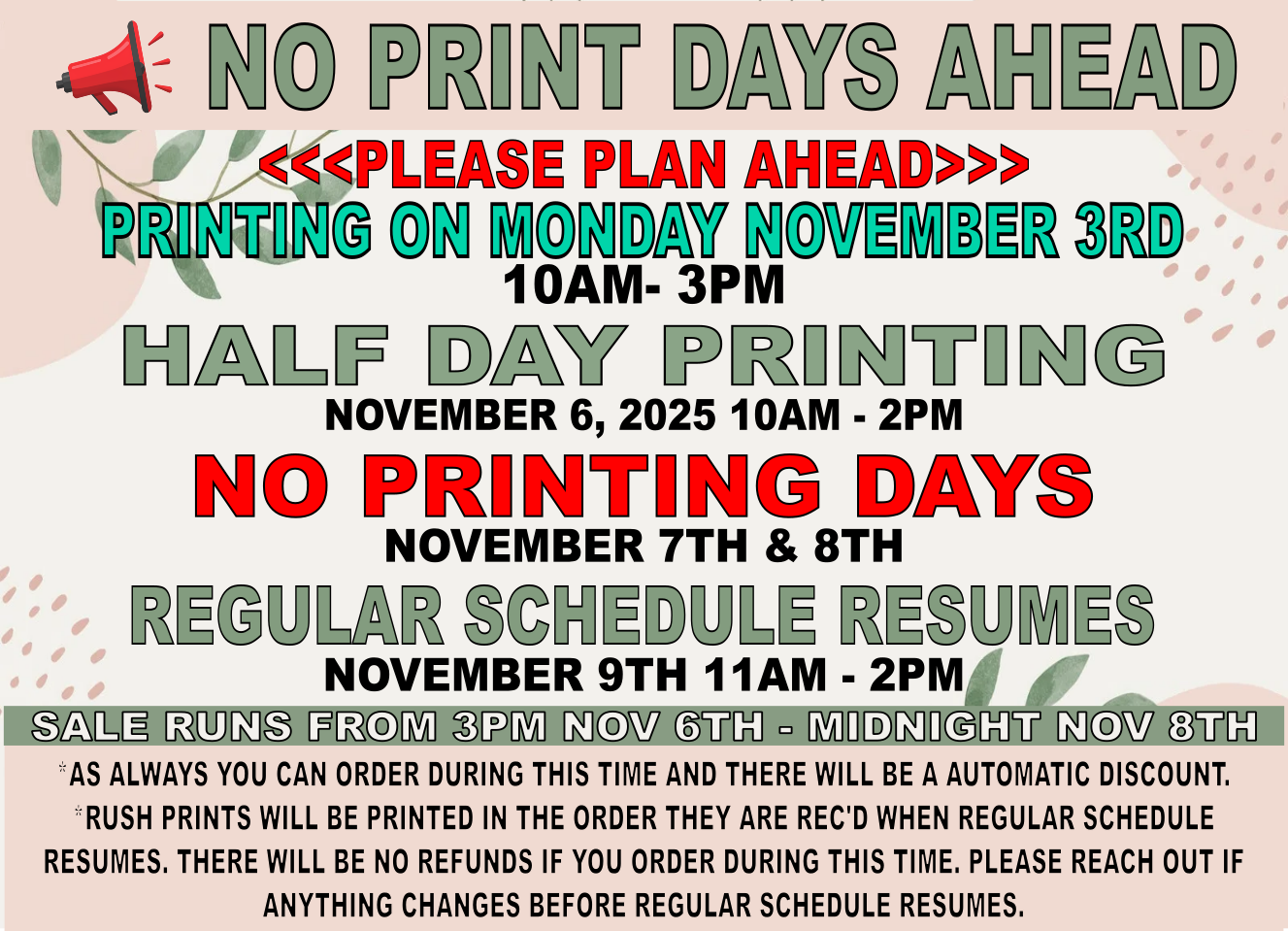 We offer print services for your t-shirt, decal & sticker needs. We will also be adding embroidery services, laser engraving and more. Thank you for visiting us and we hope to be able to accommodate your custom design needs.